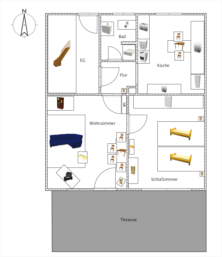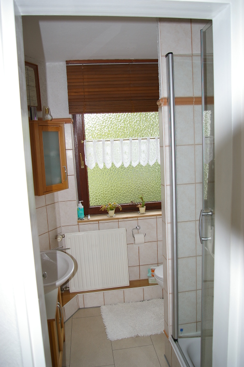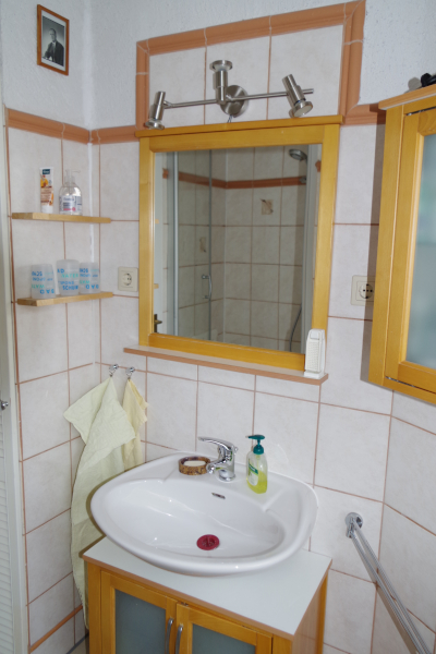 Das Badezimmer ist mit Dusche, WC und Waschbecken ausgestattet.