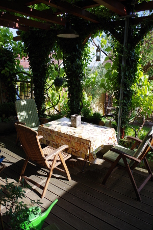 Ob unter Schatten spendendem Wein, dessen rote Trauben Sie im Herbst gerne selbst einmal probieren dürfen, oder sonnenhungrig in einem der Liegestühle, hier findet jeder seinen Lieblingsplatz.
